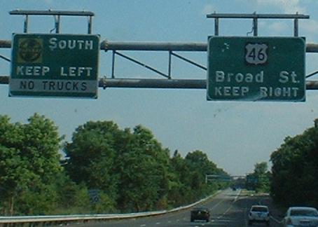 Just past the upcoming overpass is the end of NJ 19, as the median barrier ends and you're on Broad Street (CR 509, which just joined from Broad St. behind me). TO US 46 EAST is a little misleading, as the next right turn is a jughandle that allows a U-turn to access the ramp to EB 46. Replace TO with a NEXT RIGHT on the bottom.