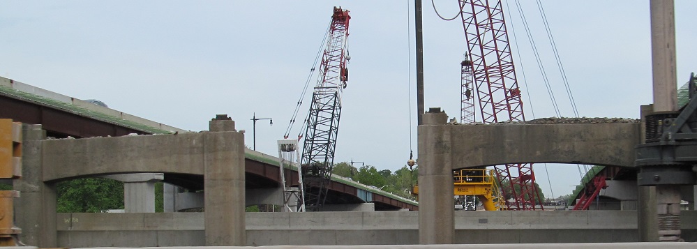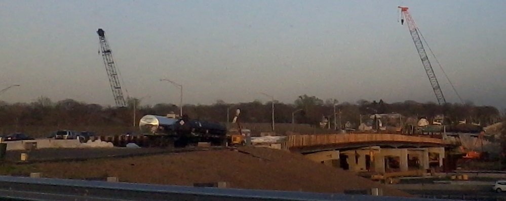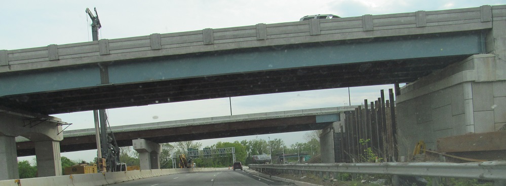 Here's NJ 3 construction as seen from NJ 21 SB in May 2013: New WB C-D road bridge going in over NJ 21 interchange ramps, new C-D road overpasses already in place, old piers from the original Passaic River drawbridge are yet to be removed.
