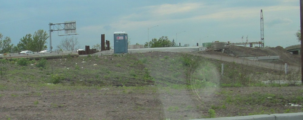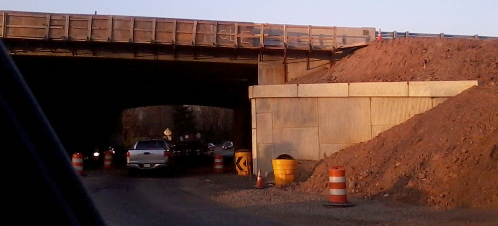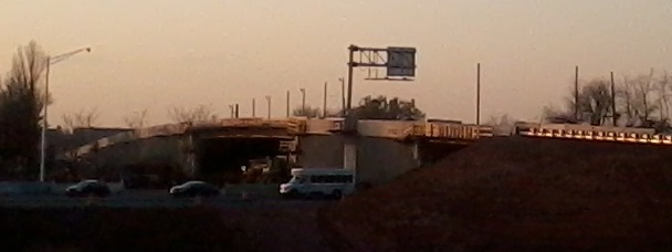 Southbound over the northern viaduct. The RR overpass hikes up its beams to allow SB 21 traffic underneath.