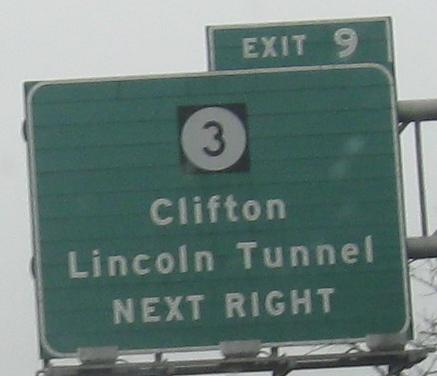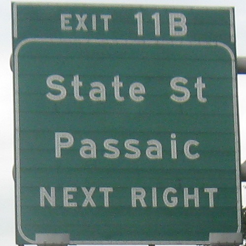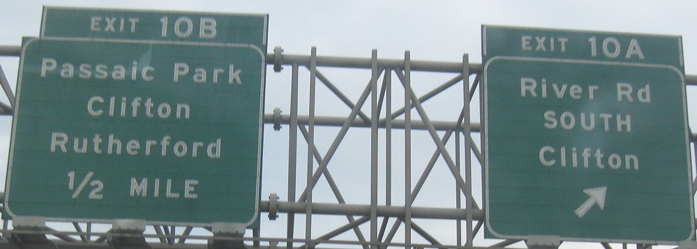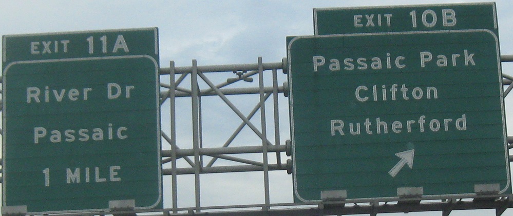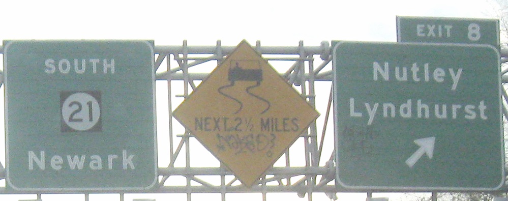 NJ 3 is important enough to get an extra advance NB BGS; the last two photos are left and right over the ramp split. The interchange is fairly weird due to its proximity to both the Passaic River and railroad tracks. WB 3's ramp is a loop that then spawns a flyover into NB 21, EB 3's ramp to SB 21 follows the RR tracks and the ramp to NB 21 actually loops backward in a trumpet, joining the WB-NB ramp before it flies over. The other half of that trumpet is the combination of NB and SB 21 to WB 3 - thus the NB side does a full 180 to face SB and join the SB ramp, stretched out around the WB-SB loop ramp. They then cross back under 3 and turn 90 degrees around the EB-NB ramp to merge with EB 3. The SB-NB ramps to NJ 3 WB work the same way. Basically, the SB ramp splits in the NW quadrant of the interchange. The NB ramp has come up the side of the river northward, and then swings over 21 and drops between the two SB offramps. The right one goes to 3 WB, the left one becomes the outside of the trumpet.