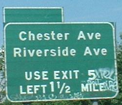 It's always suspect when you see a BGS with a blank exit tab, the remnants of the old exit number, and "USE EXIT 5" scrawled in some blank space toward the bottom. Exit 4 was a left exit at the north end of the 1953 viaduct I showed you above, cutting underneath the SB side before it had a chance to come back to ground level. Probably due to the fact that it was a fairly tight turn and somewhat blind to NB traffic, it has been grassed in, but rather than erect new signage, the patch-up was deemed adequate. SB, as you will see further down, the signage is normal and the exit is open.