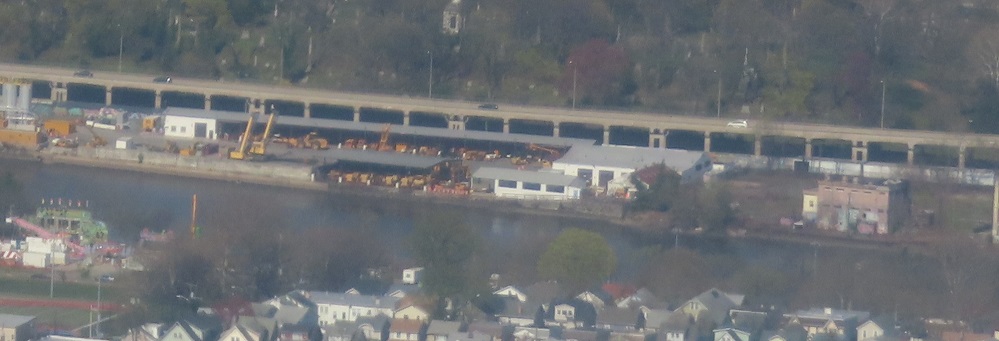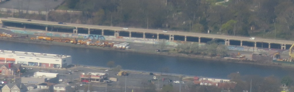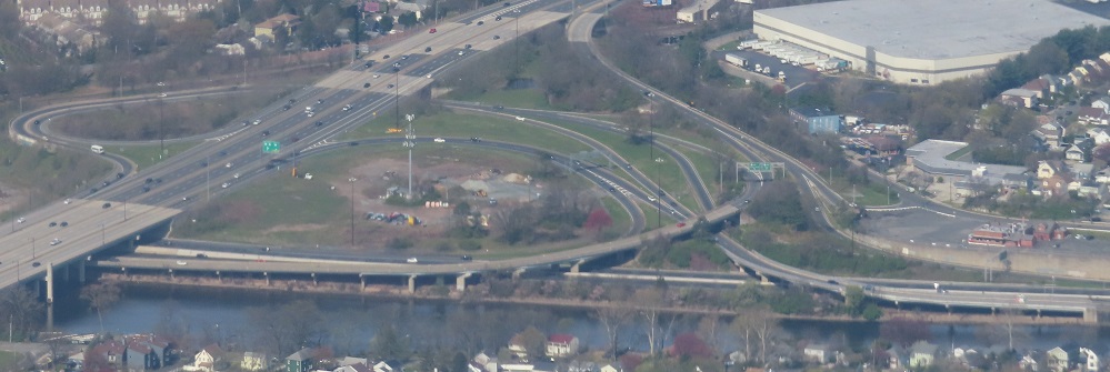 As my plane descends south into Newark Airport, here are the interesting pieces of NJ 21 I can capture from the air. The first is the classic NJ 3 interchange (Exit 9), which I talk about on that page linked at bottom. The next two are the historic 1953 viaduct carrying NJ 21 SB over NJ 21 NB to squeeze between Mt. Pleasant Cemetery to the west and the Passaic River to the east along with associated industrial properties, roadway and rail accesses.