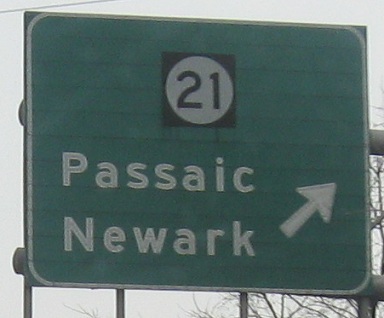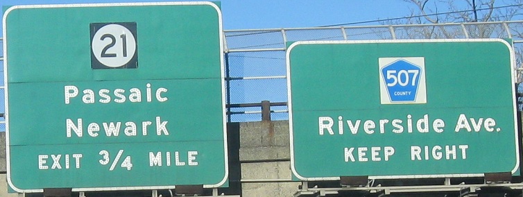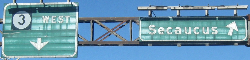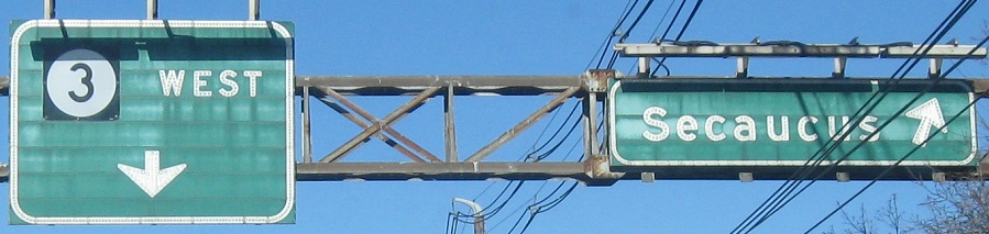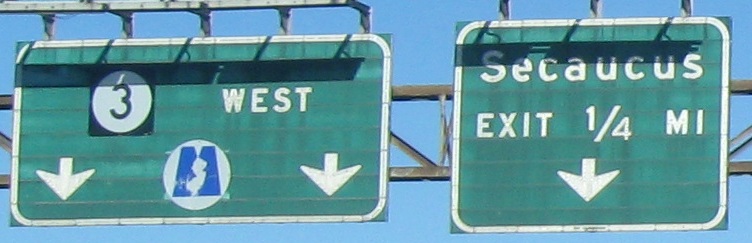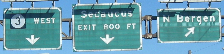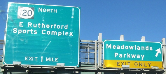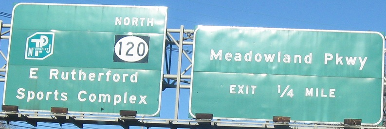 It appears that a Meadowlands shield fell off the first photo; you can see the new one in the second photo (there's an old gold-on-blue one on the eastbound side, around NJ 21). The first one is also missing a distance to NJ 120 and the Turnpike, which as you can see should be 1¼ MILES; at the very least, something should mention that those routes are accessed by an offramp, and are not the new mainline routes. Notice that the street name at the last exit has changed from Meadowland to Meadowlands. That's probably because of the famous sports complex to the west. With construction of the new Xanadu complex that remains unfinished as of 2011, the NJ 120 sign was replaced with something a lot worse - click either of the last two photos to see it. Even if Xanadu fits well into the quite large space reserved for it, there are horizontal and vertical alignment issues on the top of the sign, and the whole thing is in terrible condition for a new sign.