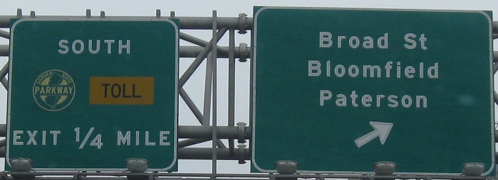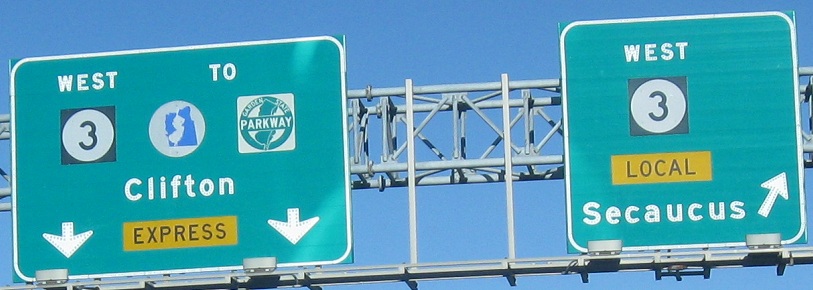 The first sign is on the ramp from NJ 495, meaning that while EB traffic to US 1-9 must use the frontage road, WB traffic from 1-9 must merge with the freeway, since the only local road exit comes from 495. The next two signs are the left (Express) and right (Local) sides of the same gantry. The final sign is the most interesting one, though. It says to Keep Right for something, and if you look closely, there are two upside-down destinations - Livingston and Madison. Draw a line connecting the two towns, and you only cross one freeway - NJ 24. I have two possible locations for this sign. It could have been the original advance for Exit 7, where everything is signed for Chatham and not Madison... or it could have been the original advance for Exit 5, constructed but never opened. That was planned Triborough Road. Check out the links in this paragraph for some very interesting photos and information, and click on the last photo for a closeup.