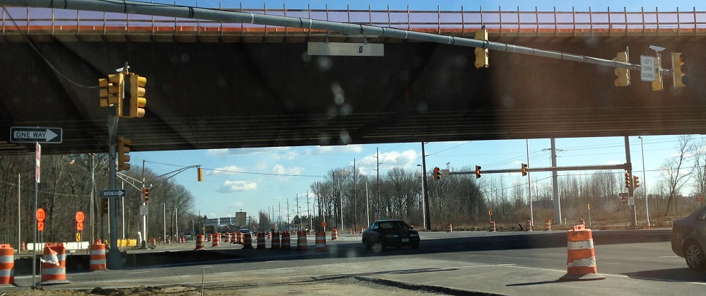 Bonus coverage from December 2013, when all the new ramps have opened: looking south along the former Interchange 8 onramp and the former toll plaza exit after the plaza has been removed, but still with an E-ZPass sign hanging out.