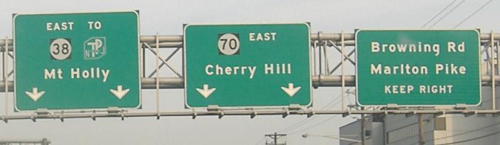 All eastbound; Marlton Pike is the old NJ 70, and is accessed via C-D road that blends back into NJ 70. The last sign is right at the gore, and the mileage sign is on the NJ 38 side because the two routes do not begin multiplexed, unlike what signage on US 130 and US 30 might have you believe.