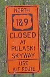 Follow traffic toward US 1-9 NB in the 2010s and you'd find these signs on the ramp during the 4-year Skyway rebuild that had the NB lanes closed as the SB side shifted around. It would be nice if the Turnpike NB had these signs as well so that traffic knew not to bother exiting to save on tolls.