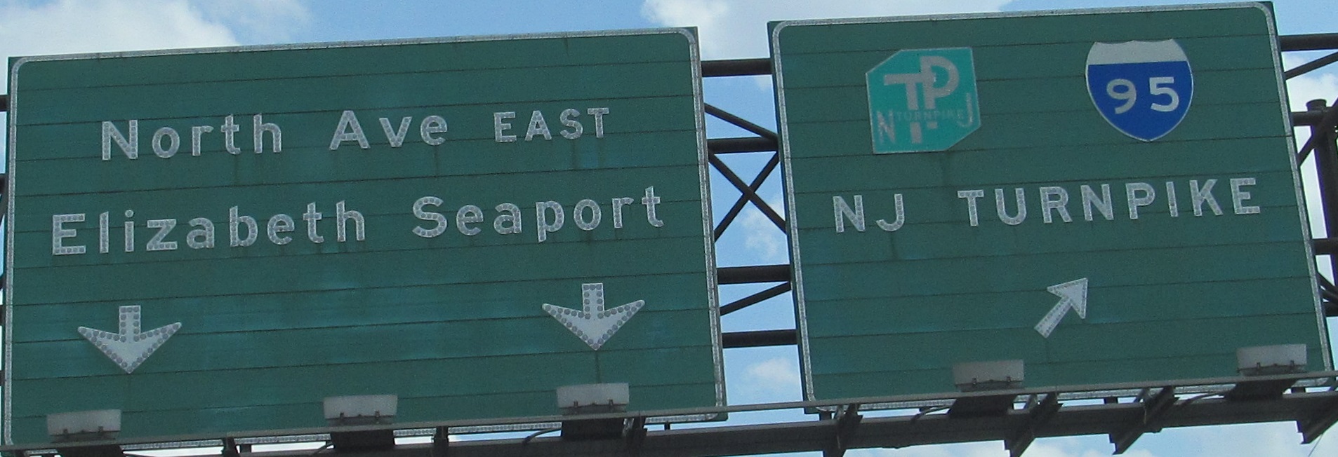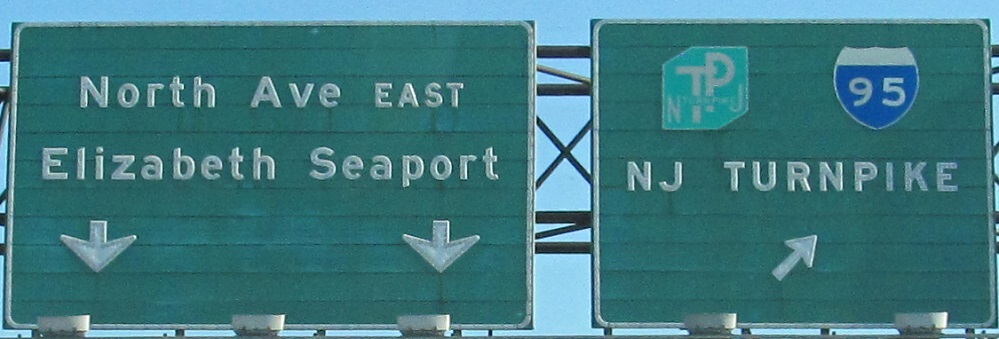 EB past Dowd Ave. to enter NJ 81 SB to Turnpike Interchange 13A. The latter sign is for NORTH AVENUE EAST, ELIZABETH SEAPORT; the rightmost lane is involved in a U-turn ramp. The first sign is just as old as the BGS's on US 1-9 SB at the beginning of NJ 81 - in fact, all of the BGS's on and around NJ 81 are probably from when it was constructed. Click on it for a closeup, and check out the NJ 81 link at bottom for more. The sign assembly for the NJ Turnpike is cool because it has that little circular arrow.