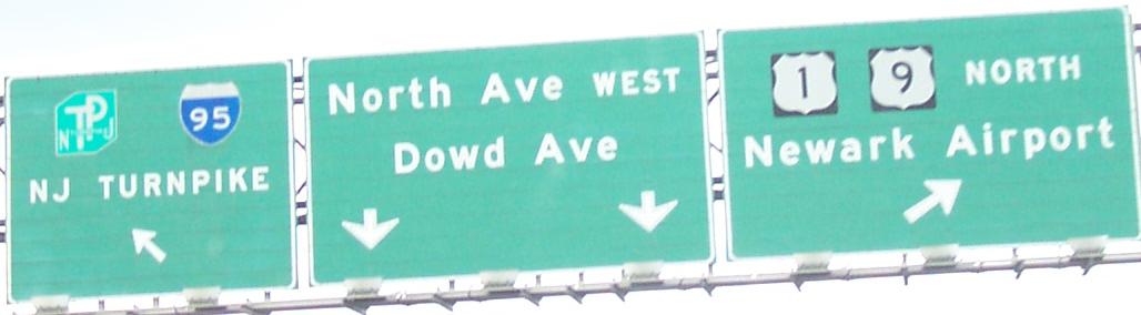 Bearing right at the first sign assembly (photo courtesy HNTB Corporation) merges you with NJ 81 shortly before it splits to US 1-9 NB and SB - so technically you could just follow that ramp to 1-9 SB, instead of following North Avenue WB to the left, underneath 81, and essentially U-turning at Dowd Avenue.