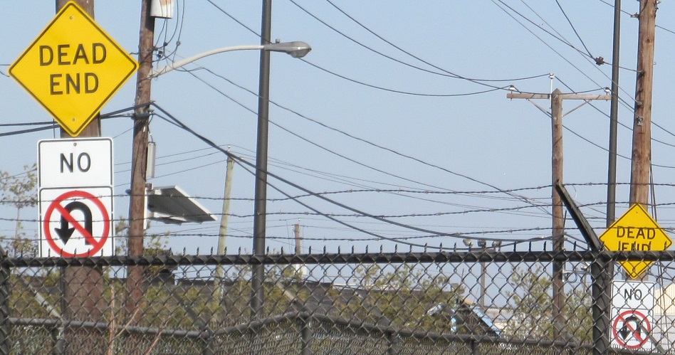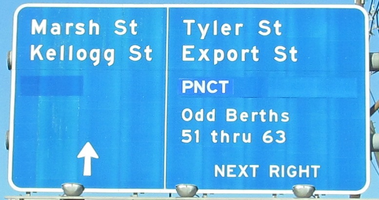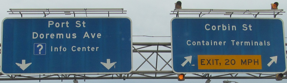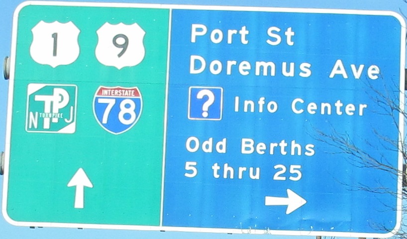 Names change but the road stays the same; this is now Corbin St. NB from Elizabeth into Newark. Port St. is an interchange affording the opportunity to escape over the NJ Turnpike to reality, but I will head deeper on Port St. to Doremus Ave., the path of former NJ 65 through here. Since it's all maintained by a (bi-)state agency, it could keep a route number if it wanted. The Port Authority was ahead of the ball in NJ with removing the black border around shields, but behind outlining the Turnpike shield instead of the white square.