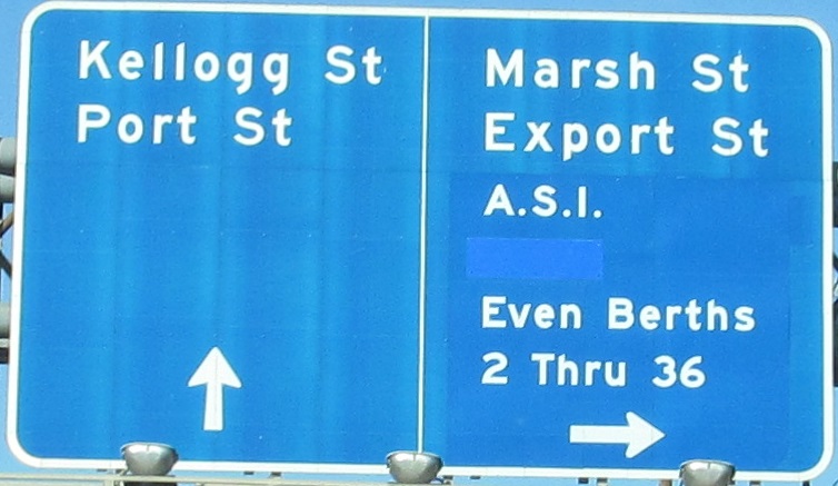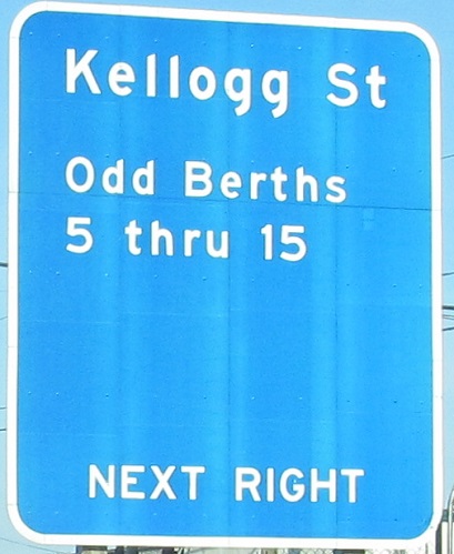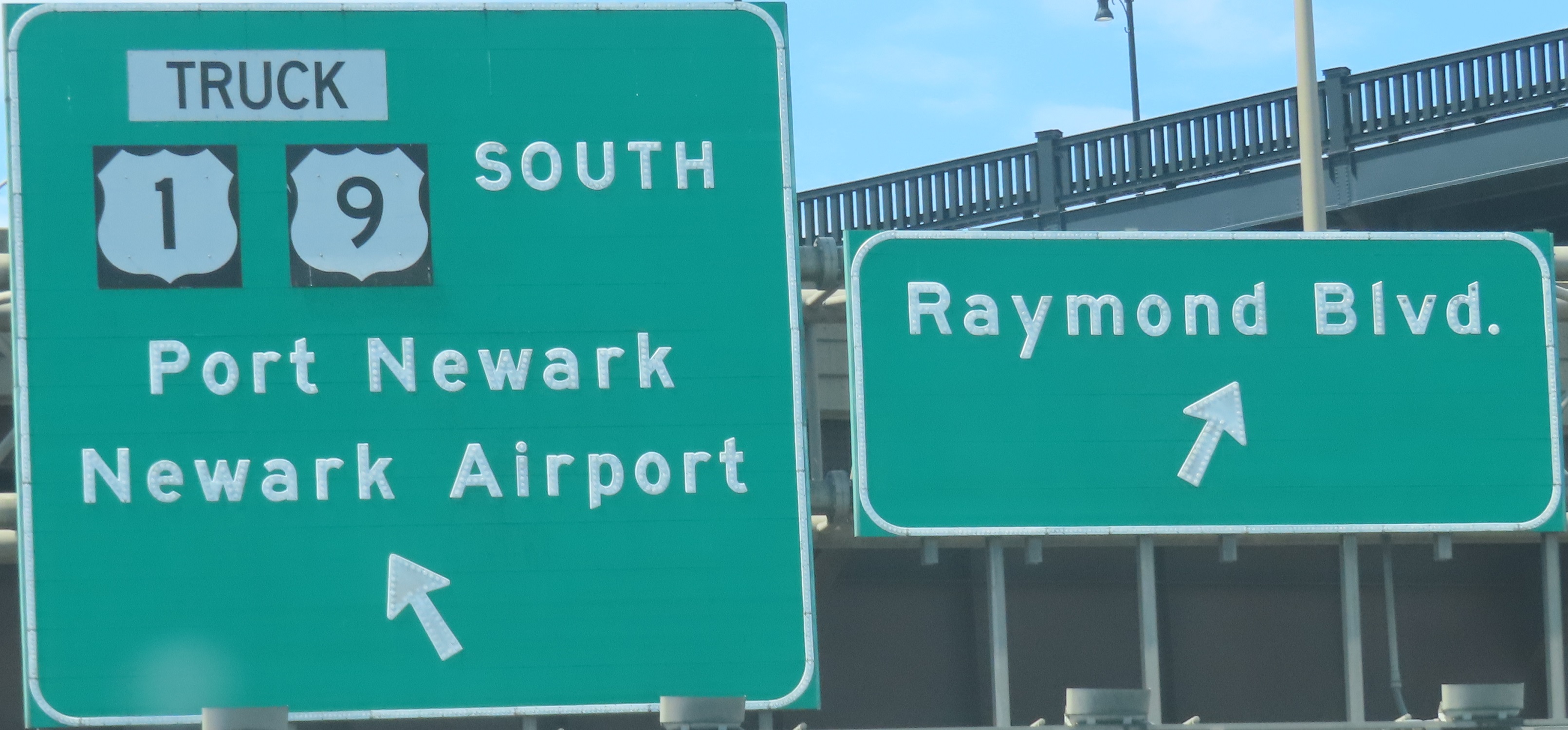 It will also afford you button copy. I skipped the first photo in the last run to bring you more truss, but it would have shown up after the 2nd Skyway photo, mounted on US 1-9 Truck. The I-95/US 1-9 Truck/Doremus Ave. interchange is a complicated double-trumpet that is past due for a rebuild and a general port-area rethink. So before these signs disappear, click on the second photo for a closeup. The TRUCK banner for US 1-9 SB is superfluous at this point, with barely a quarter-mile to go before it merges in with US 1-9.