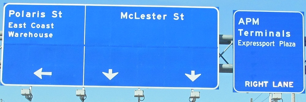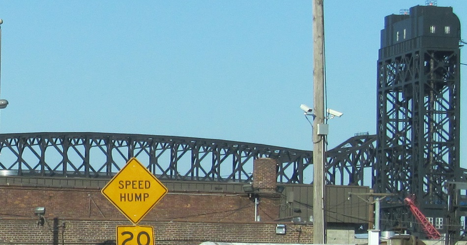 McLester St. north from North Ave. in Elizabeth, the beginning of the Port district marked by Port Authority-standard lane stripes and blue signs instead of green. I'm not sure of the rationale, but it very clearly tells you where you are. I can vouch that the clearance sign is not PANYNJ standard, but the cute street sign ship very much is.