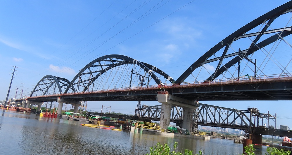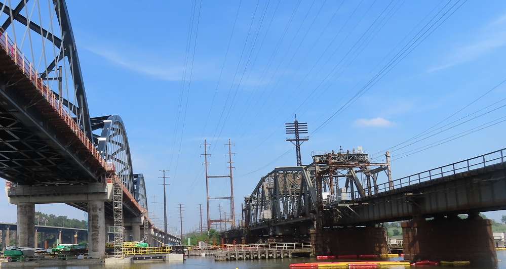 From the western walkway, which is planned to become a public recreational pier once construction is complete, the new bridge towers over the old. That's because the existing bridge is a drawbridge (a "swing span" that will pivot 90 degrees) while the new one will be fixed in place, so it needs to rise with enough clearance above the Hackensack River navigational channel, resulting in three tall arches. It will also need very long approaches because it is going over Meadowlands wetlands and former contaminated areas, which require untold amounts of special care during construction. See more at the links below.