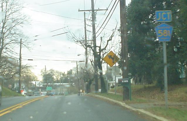 581 comes into 77 at a sharp angle, so a turning roadway is provided for north-south turns in either direction. The guide sign facing 581 north is visible in the first photo and 581 heads south in the second photo.