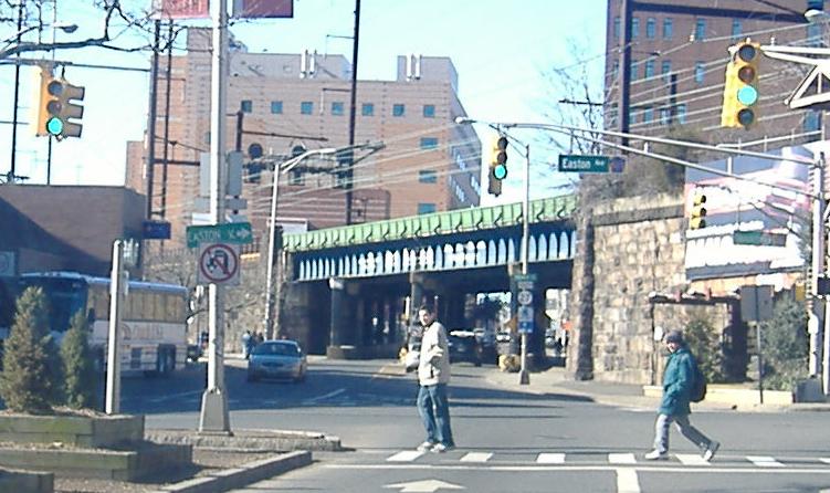 Looking south from Hamilton Ave., 514 west/527 south are coming from the left. Straight ahead is 514 west, turning off of Easton Ave., while 527 south continues to the right.