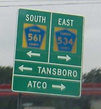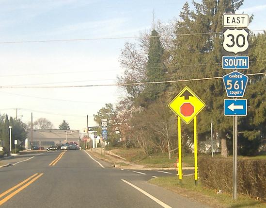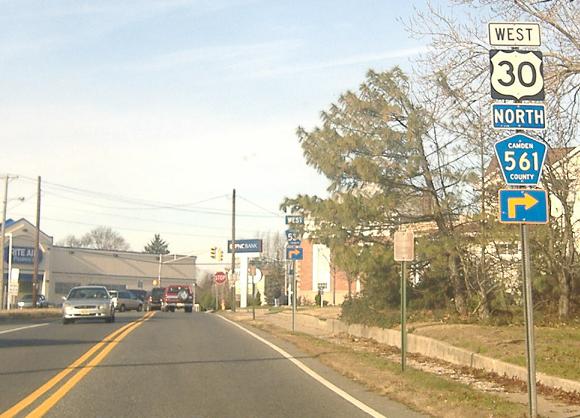 30, 534, and 561 meet in Berlin. Although 561 meets 30/534 a block east of where 30 and 534 meet, traffic following 561 south must turn right on 30/534 west to simplify the five-way intersection with Cross Keys Rd. by making 561 north one-way away from the intersection. 561 south traffic then uses the 534 west jughandle to U-turn and follow 30/534 east. Historically, 561 had a straight railroad crossing instead of the current overpass on a new alignment, and so the multiplex began at the 30/534 intersection anyway.