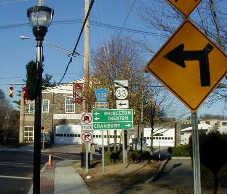 571 meets 33/539 halfway between the ends of their multiplex in downtown Hightstown.