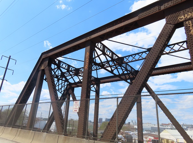 Signage from the lanes above Newark and the adjacent rail truss over Hawkins Street and another rail spur. Notice the difference in the ages of the signs; the local lanes' older signage gives a less recognizable destination, uses all caps, and is made of button copy. (The Wilson Ave. sign was later replaced, but I got you a clearer version of those that remain.) This is due to reconstruction in the 1990s, starting with the SB lanes (originally both directions) to remove the original center exits and entrances that still typify the Pulaski Skyway, and then putting US 1-9 NB onto its original alignment (SB express lanes) to reconstruct the newer NB viaduct. My guess is that the old SB express signs had to be taken down to mount temporary NB signs on the same gantries.