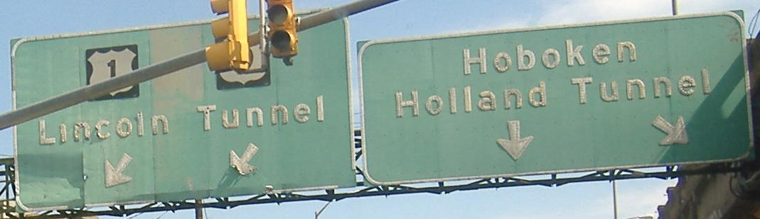 Hey look, a picture from the Skyway snuck in here! The LGS on the right corresponds to the Tonnelle Avenue exit from the Skyway, where US 1 and 9 drop off the Skyway and spawn NJ 139 toward the Holland Tunnel. The LGS's on the left were on US 1-9 Truck, hence their inclusion. Just as on US 46, there are two arrows pointing to one lane, although of course it refers to the fact that two lanes will go toward the Holland. Interestingly, there's no mention that the road one takes to the Lincoln Tunnel is US 1-9.