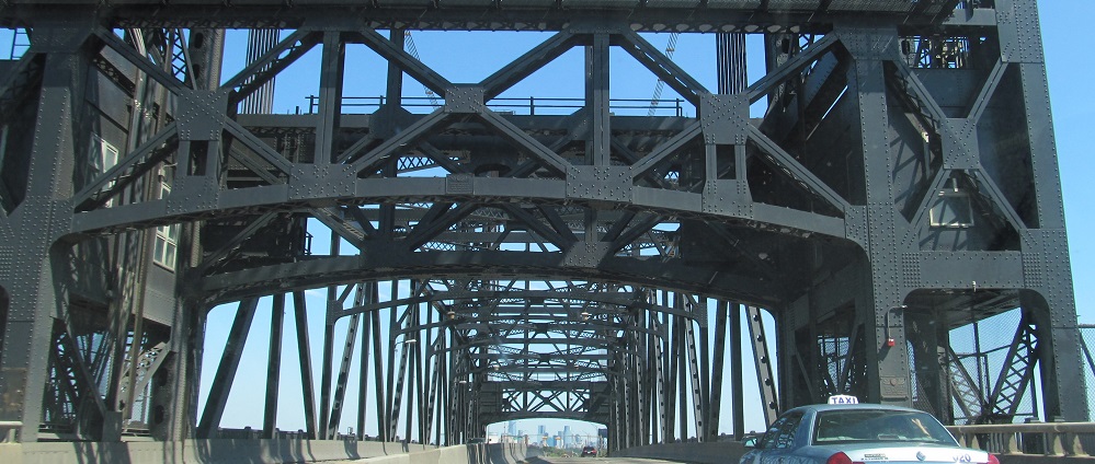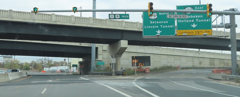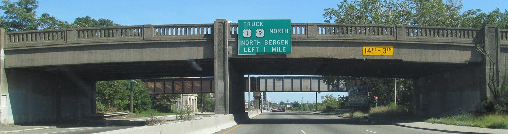 US 1-9T has views of the easternmost (railroad) truss on the Skyway as it briefly runs along Broadway in Jersey City, which then becomes No-Truck as it heads east from US 1-9 Yes Truck.