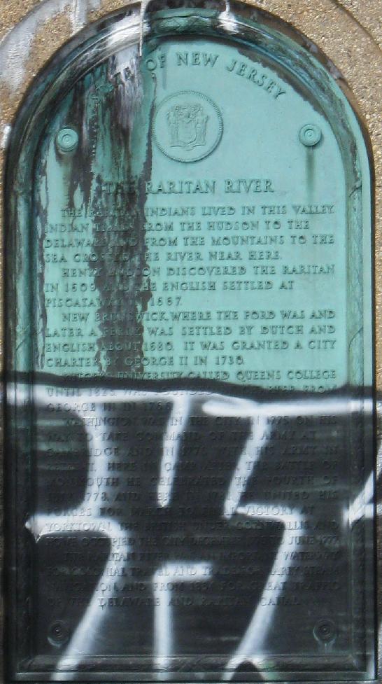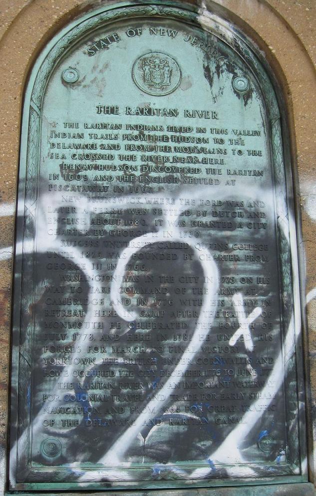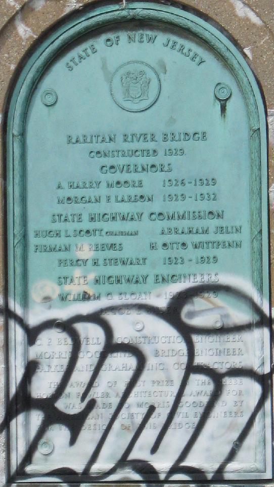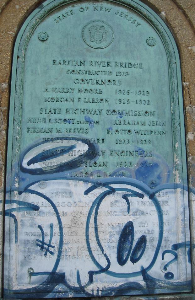 On the former SB side, now the left side of the NB lanes, is a commemorative plate, and on the right side is a history of the Raritan River. Click on each for a closeup so you can read the text through the graffiti.