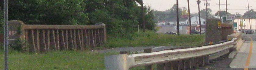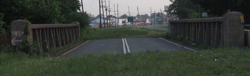 Talk about coolness, Burlington City's got it (visit the link below for a couple of nice signs). What you're looking at isn't just the original NB alignment of US 130, but the original alignment, period. In 1924, the predecessor to NJSHR 44 was paved through here, and put on this bridge. Sometime later, when this was NJSHR 44 and US 130 together, the highway was dualized through Burlington to four lanes; the existing bridge became northbound, and the new bridge, still in use, became southbound. Then came the Great Renumbering, and US 130's NB side was moved a block to the east, abandoning this bridge which is still used by quite a bit of foot traffic. The fact that the stripes here are double white indicates to me that it was so striped due to its narrowness for as long as it carried only the northbound lanes - the stripes are quite fresh considering how long this has sat unused. Excitement continues: