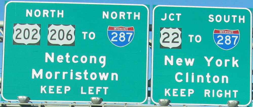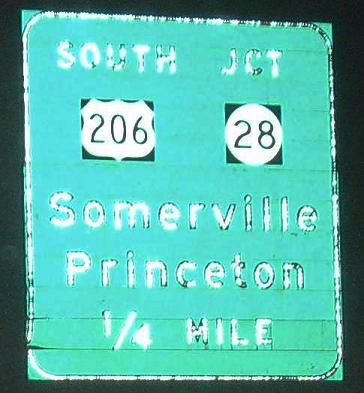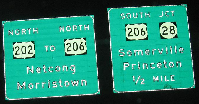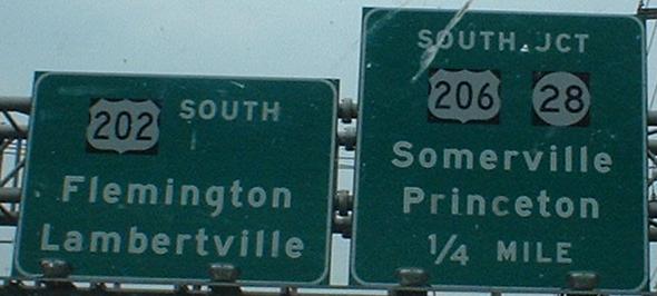 NB signage approaching the Somerville rotary. This traffic circle was much more ornery before US 202 through traffic flew above it, but it still needs to die because US 206 traffic toward Princeton continues to increase. That road needs to be a freeway.