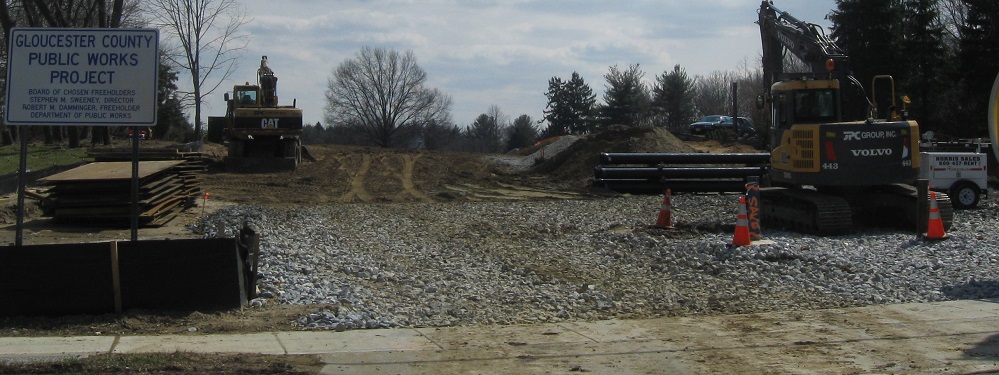 All this work is to tie a new Mullica Hill bypass into the northern US 322/NJ 45 intersection. 322 will glide straight across, skipping town and meeting the old alignment at Clem's Run. The sign at the left of the construction driveway shows that this is a county project, despite the end product being a state highway. For that matter, Gloucester Co. will continue to maintain the road.