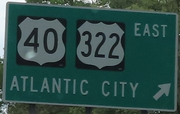 Borderless shields on new signs I'll get used to. Maybe the spacing isn't ideal, but it still beats the narrow 3-digit shield on the sign below it. US 40 EB meets US 322 at a converted circle and they ride together into Atlantic City, but US 322 really should just end here.