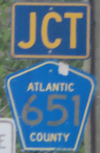 US 40 WB/CR 557 NB on their short but fruitful duplex. The second photo is from CR 627 NB (but easily photographed from the passenger seat), with the Padre Pio shrine in the background. All the signs say Atlantic County, so why not the last shield? Actually, CR 557 crossed the border to Burlington Co. as soon as it turned right at Brewster Rd. and then immediately left again. Since then, the junction was then moved to a realigned Tuckahoe Rd. a half-mile west to simplify this intersection, and the shields there all say Burlington.