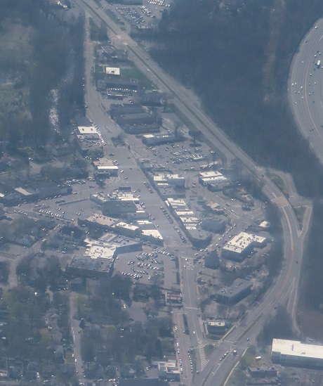 The entirety of Denville from above, looking east. US 46 comes in from the bottom and splits from its old alignment. From there, the wide straight Broadway you see is the "new old alignment." The "old old" alignment curved right, with Broadway not yet in existence, and then turned left on Bloomfield Ave. right before the interchange at right center. That is why NJ 53 begins at that intersection. The old alignments come together as they head east, and then come back to modern US 46 at the very top of the image. With I-80 to the right, you've got four generations in a single photo!