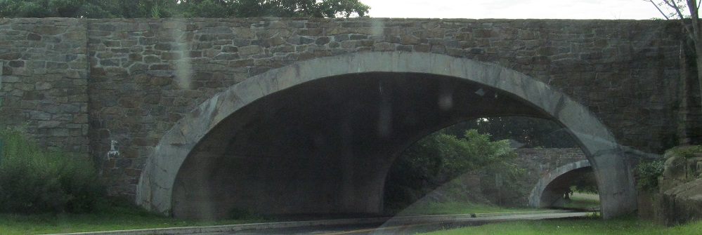 The southeastern bridge abutment of the long I-95 overpass (with six roadways beneath - Express, Local, and US 46 in each direction). Two or three disconnected pieces of the bridge were constructed in 1930, with the original set of bridge approach roadways, and then in 1960-61 the entire structure was connected across the freeway agglomeration seen today - this is when the Bergen-Passaic Expressway (now I-80) was tied in and the bridge got a second deck.