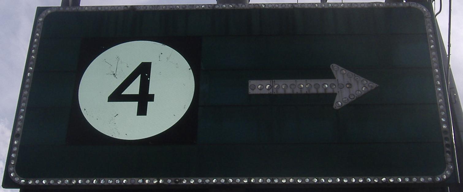 This is SB at the next intersection up, which is Bridge Plaza North to the east. Click for flash-lit closeup that shows the outline of the original circular shield behind the 4. That's right, once upon a time (1960, I'd bet, when everything else here was constructed and reconstructed) NJDOT didn't have black squares around all its BGS shields. Those shields were button copy, too.