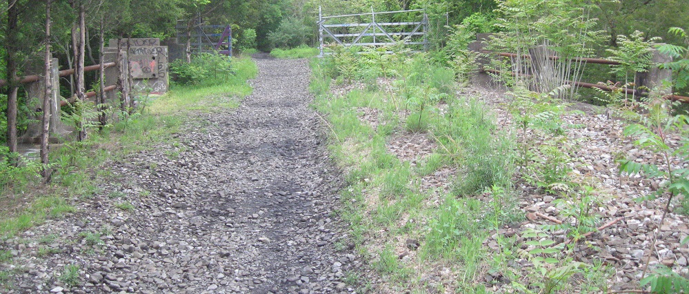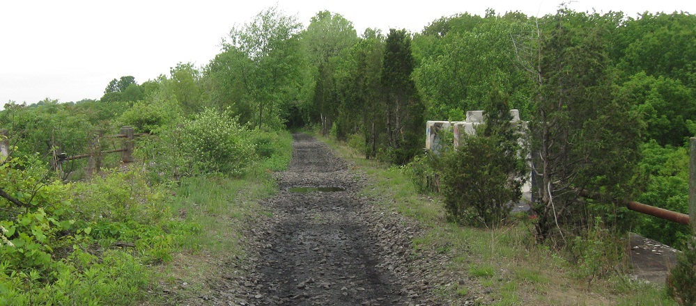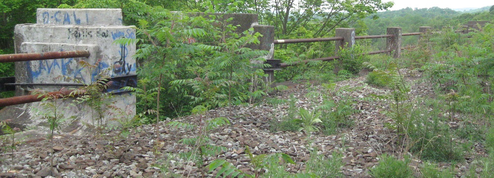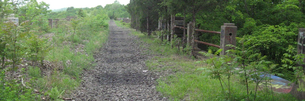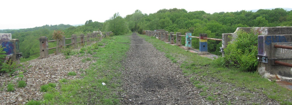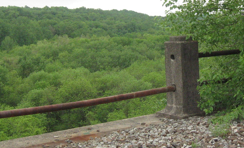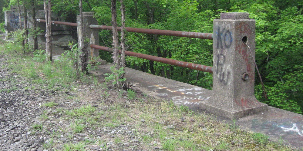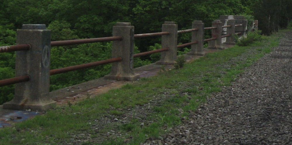 Up through the manhole to the railroad deck, and I'm starting to rethink this. The "railings" are in laughable shape, and indeed, why would a dedicated rail bridge ever have even had them? They're not holding back anything that derails. Just staying on the east abutment gives you the age of the bridge and a taste of what it was like when active with minimal potential for death. Just add tracks and subtract trees.