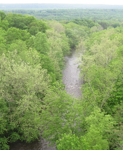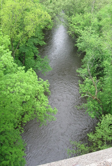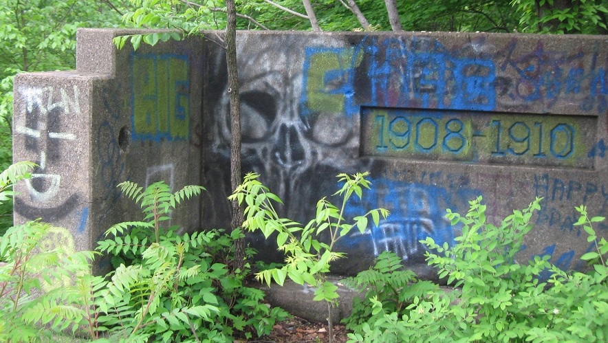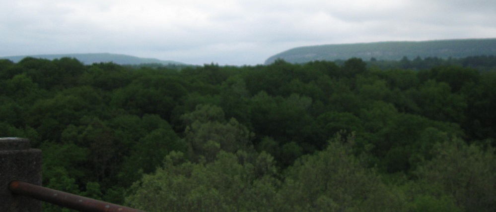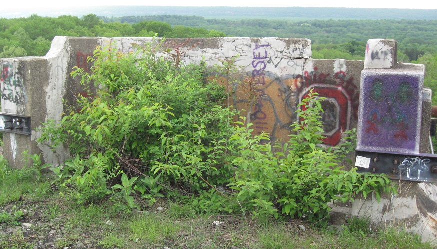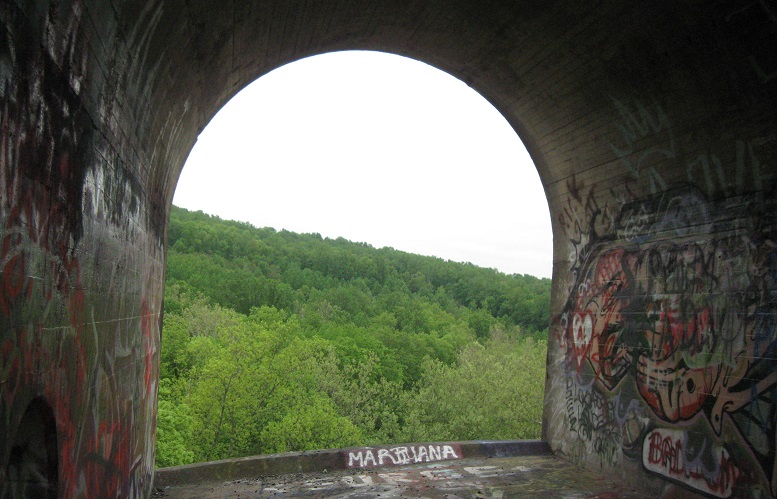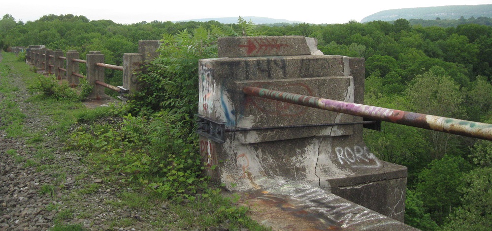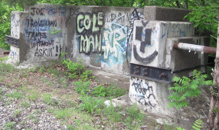 The more adventurous person will travel across the span and out over Paulins Kill. Graffiti artists tend to be more adventurous, so they have turned an old parapet into a patchwork of art. The Delaware Water Gap rises to the northwest.