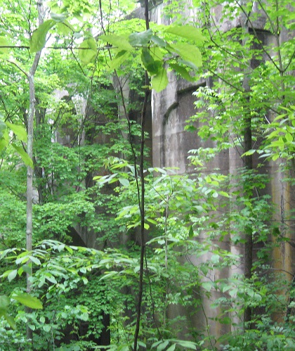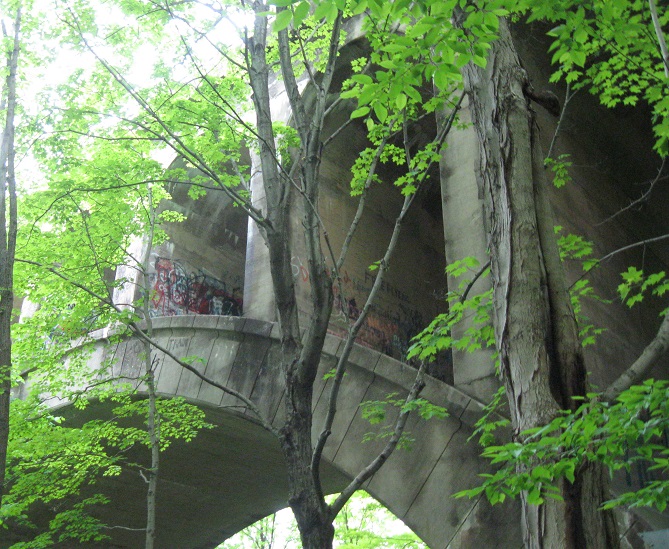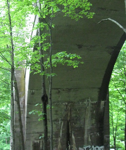 The bridge is relatively accessible; there are no signs prohibiting trespassing and multiple ways onto the bridge. The easiest way depends on your skill set: you can park down the trail to the east or west and jog or bike here, you can park on Station Rd. and walk up the side of the trail, or you can park on Station Rd. and climb the wooden planks into the bottom of the first meta-arch (what else do I call this?). For this visit, I chose option 3, where there was a nice ladder of multiple angled planks, sticks, and ropes to help me up. If that ladder is not available and you have not brought your own, you can find these views by dropping down from the top through a conveniently placed manhole and following the inner trail of handholds seen in the last photo. As the meta-arches get deeper, the inner trail gets steeper, since the main arch is heading toward vertical.
