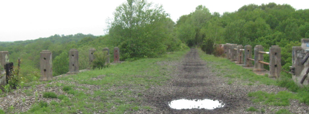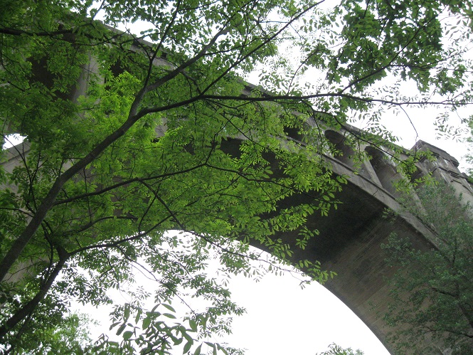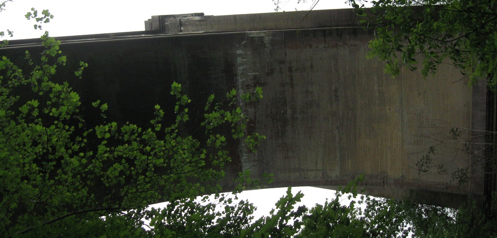I've now crossed under the bridge for views from the slope on the south side of the bridge's east approach, looking northwest as the ground falls away from the bridge arches.