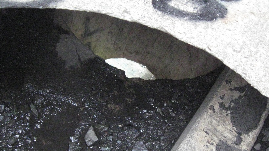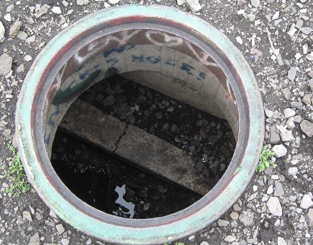 The most adventurous person will spy an open manhole and wonder what's inside. Besides a drain opening clogged with cans, anything else that was in here is gone, though it might have always just been an open concrete pit. The key is that there's another opening that looks out on the river far, far below. It takes guts to crawl into a tiny space that's about 60% floor and 40% certain death.