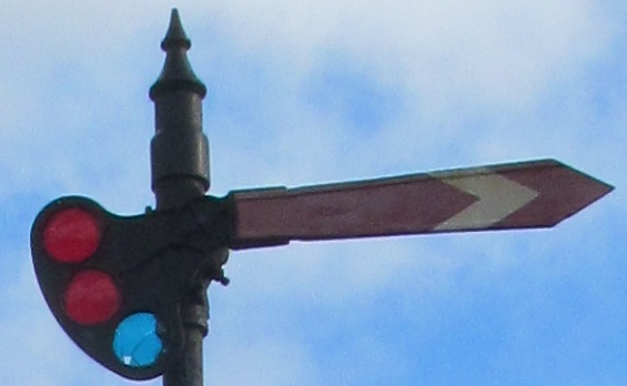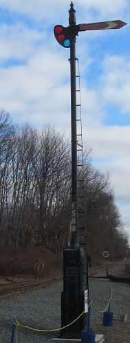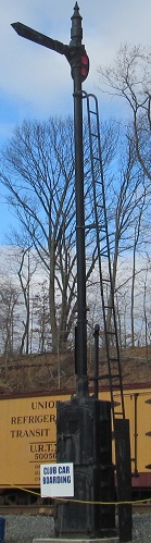 Railroads have signals just like real regular vehicular other roads, but the symbols are much different since only trained conductors need to learn them. This signal is so old it comes complete with a ladder for manual operation, not to mention an old pole location number.