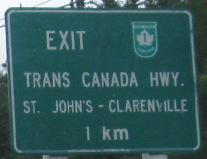 SB at TCH 1. Take a good long look at the first sign with its rounded corners, because you need a lot of beauty before you let your eyes wither upon the ugliness to follow. Newfoundland uses "Exit" when it means "Junction," which piques one's curiosity when one finds a narrow two-lane road (or better, a dirt road) that has an upcoming Exit. Okay, now brush your eyes across the second photo and quickly wash them out. That awful white square is the present and future of Newfoundland route signage. That's what the green square correlates to, and that's why as cute as the green square may be, it's a deadly poison on signage. Newfoundland also has a habit of including the direction inside the rectangle as a single letter, which works alright but leaves a hint of suspicion that you're on, say, Route 90S instead of Route 90 South. Finally, modern signs drop the "Newfoundland" from inside the banner of the TCH 1 shield. Unfortunately, if you stared too long, you won't be able to read my critique. Have someone read this to you - it's worth it.