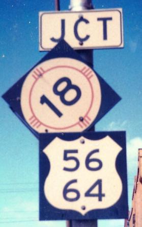 US 87 NB with a great multiplex shield, first entering Clayton and then exiting with US 64 WB, courtesy Michael Summa and taken in 1984. It's interesting that the two US routes would be grouped on one sign when they happen to split at that very intersection, and it's also interesting that the NM 370 shield couldn't be made in one piece (or is it foldable?). NM 18 was truncated much farther south, to Lovington, in 1988.