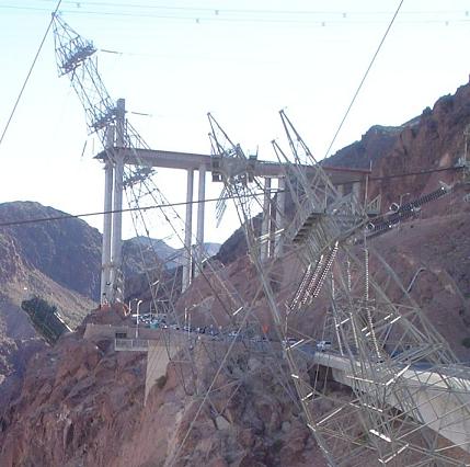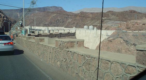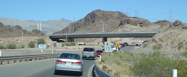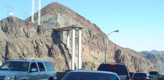 The queue looks prettier on the Arizona side as it winds up the hilltop. People seem to love to say "I stopped on the Hoover Dam for photos instead of parking!" Oh, Lou tells me there's a security checkpoint in there too, and I'm sure that doesn't help matters. The old stub of a bridge in the second photo looks like it was the original (pre-dam) alignment of US 93 on the Arizona side, and is now used as a parking lot for something.