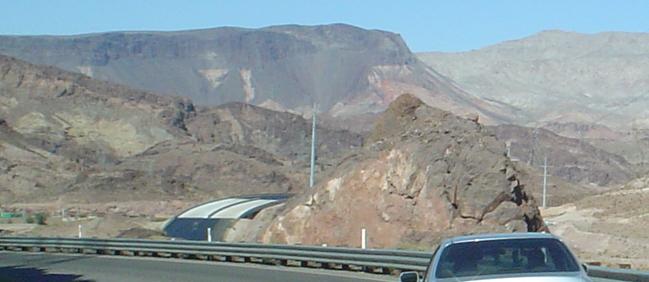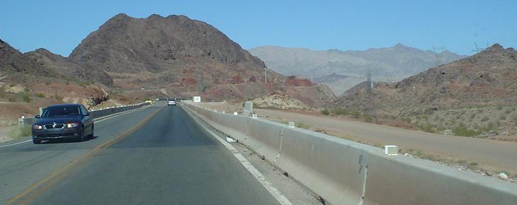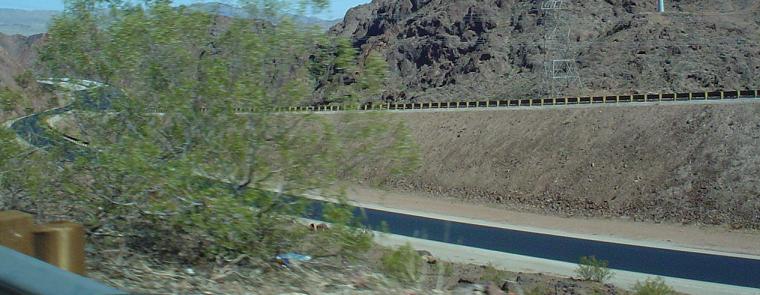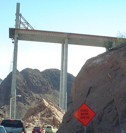 SB views of the ongoing dualization of existing US 93 that then breaks off into a new freeway alignment. It will avoid the hairpins on both sides of the Hoover Dam and have a great view of the dam from the south. The problem will be getting drivers not to sightsee from the new road but only from the old one.