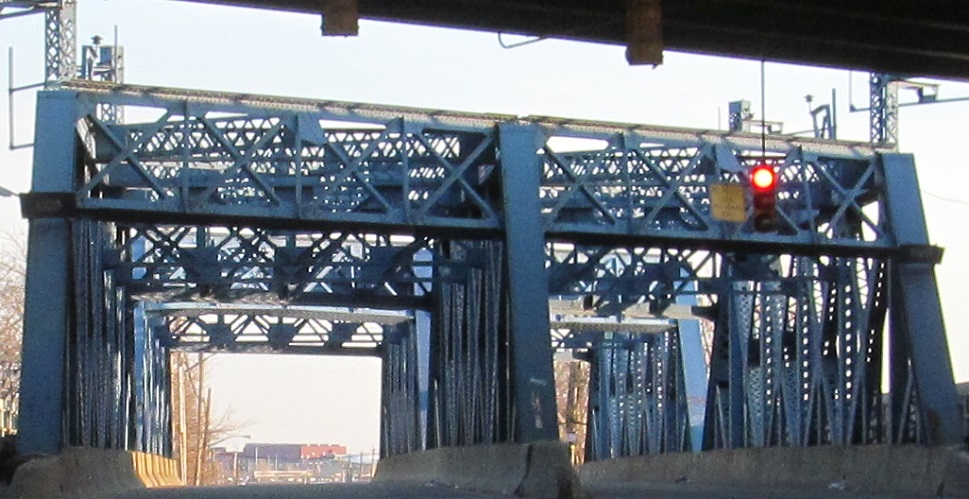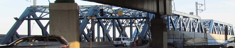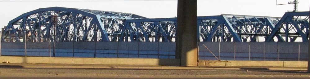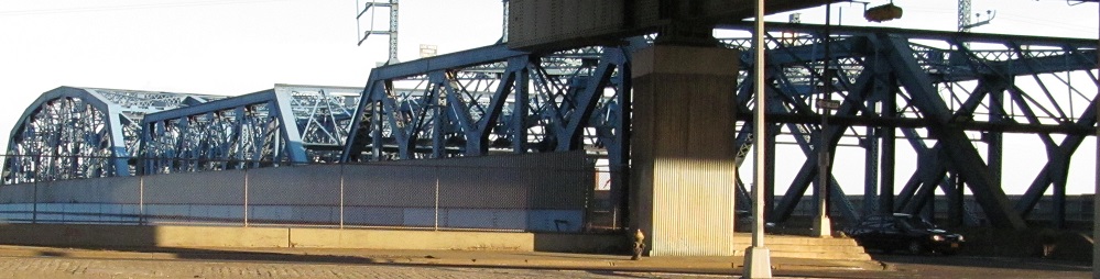 This span was the original Bruckner Blvd. crossing of the railroad tracks west of the Bronx River. When I-278 was shoehorned into the Bruckner Blvd. corridor in typical Robert Moses fashion, the freeway WB lanes ended up in the surface street EB bridge truss. However, the bridge was only built for two lanes each way, forcing an awkward lane drop and no-room merge from I-278 WB onto Bruckner Blvd. WB, which still occupies the original WB (right) side of the truss. Bruckner Blvd. EB shares a newer span with I-278 EB.