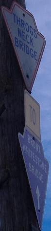 Some of the WB button copy through the circle and interchange has been replaced, leading to a reverse-color Parkway shield. In between what remains is a barely readable sign for the 1953 Bruckner Boulevard bridge over Westchester Creek, the Unionport Bridge draw span. The Cross-Bronx and Bruckner Expressway fly overhead on a trio of fixed spans.