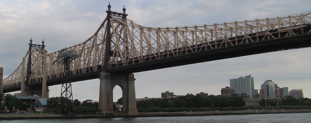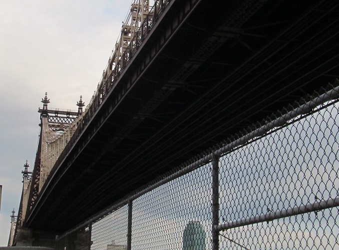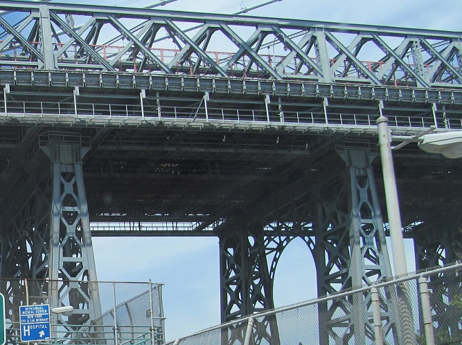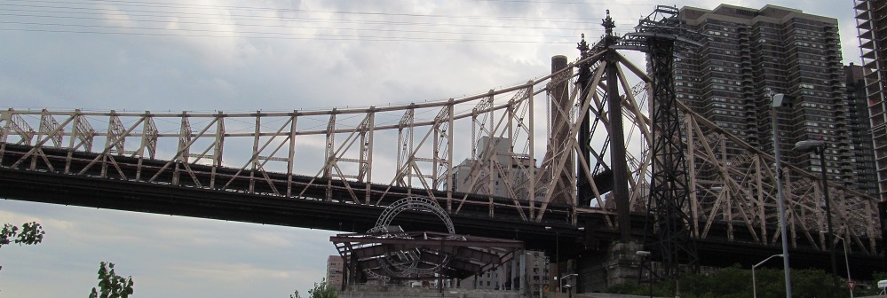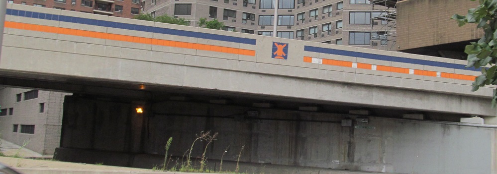 This is the last of the long underpasses/cut-and-cover tunnels along FDR Drive, which then affords some views of the southern leg of the Triboro Bridge, Hell Gate Bridge (the red railroad arch behind the Triboro), and the pointy pedestrian-only Ward's Island Bridge. The third photo is courtesy Lou Corsaro. Click on the 4th photo for a closeup.