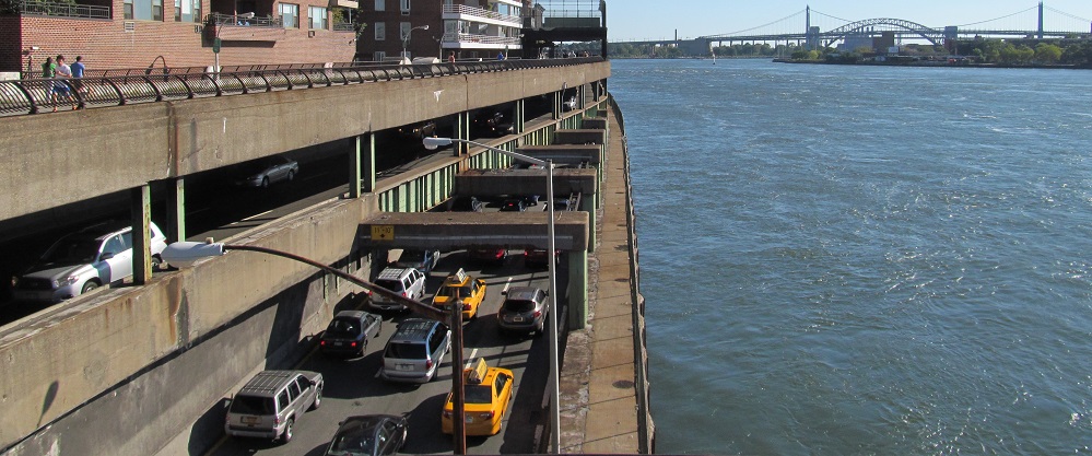 The first photo looks north from the tramway adjacent to the Queensboro. It connects Manhattan to Roosevelt Island as an alternative to the subway, and it's worth it for views like this and on the Queensboro Bridge page (see link at bottom). The second photo looks north at 81st St. as FDR enters a double deck within view of the Triboro and Hell Gate Bridges. You can see how FDR Drive was designed to weave around and under/through buildings.
