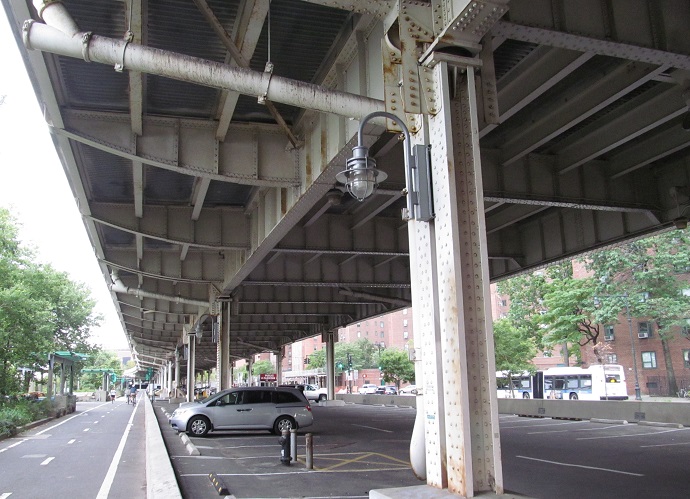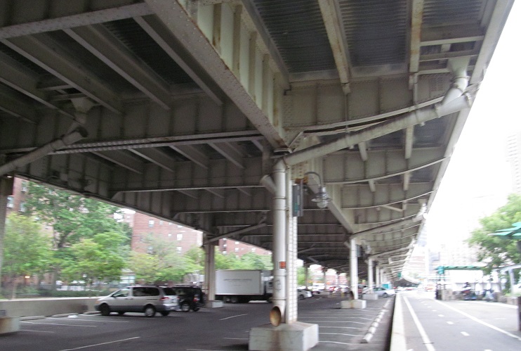 Looking north and south from under the structure in Stuyvesant Town on the NB-side mixed use path (between Exits 7-8).
