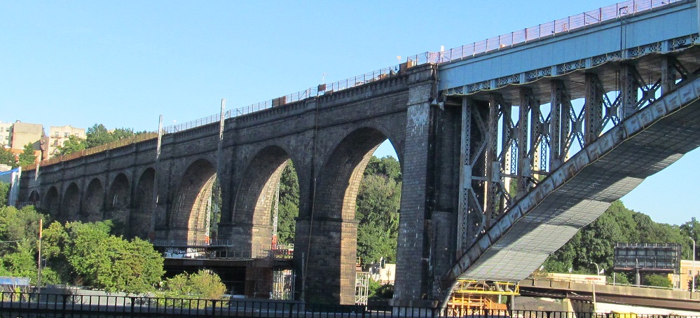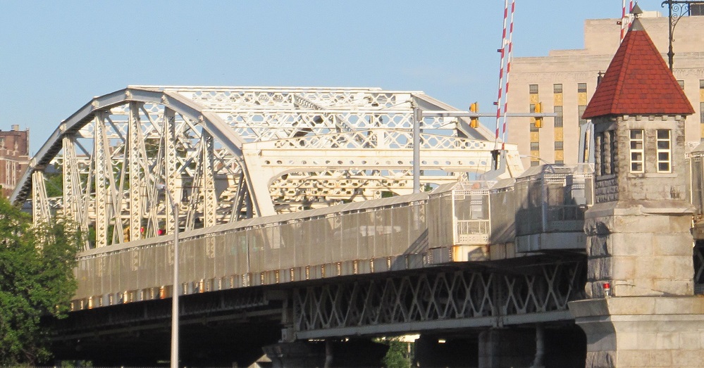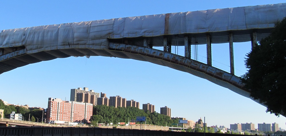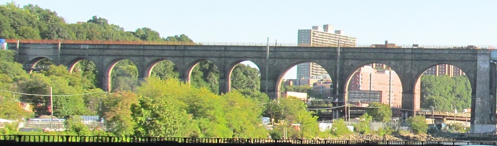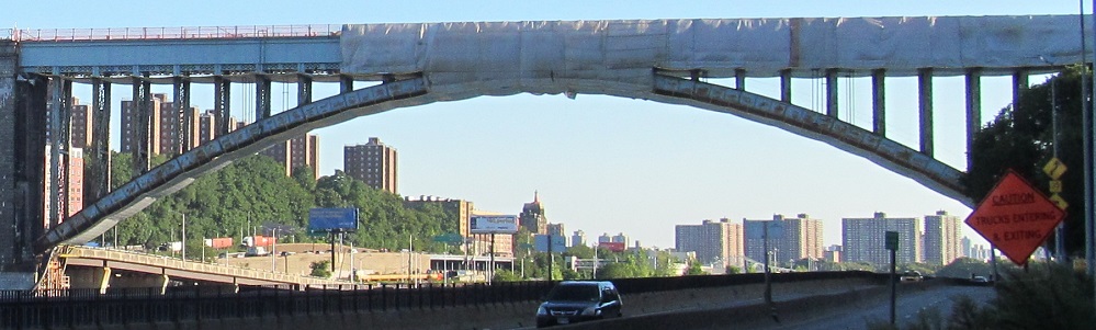 Harlem River Drive from the top. The pavement quality isn't even as good as on other NYC freeways because hardly anyone comes up this way. The bridges, in order, are the somewhat dirty Hamilton Bridge (I-95), the 1889 Washington Bridge, and the High Bridge. The High Bridge, namesake of the I-95 interchanges on both sides of the river, a Bronx neighborhood, and a Manhattan park, is actually officially known as the Aqueduct Bridge, because it had been part of the original Croton Aqueduct that supplied fresh water from the Croton River to New York City. (The tower in the last few photos is the High Bridge Water Tower, related to said aqueduct.) It is the oldest bridge in the city, dating to 1848, except the steel arch in the center was constructed in the 1920's (originally, the entire bridge had stone masonry arches, but those were deemed a navigation hazard). Since the aqueduct was bypassed in 1917, it has been a pedestrian bridge, but it closed in 1970 due to a mischievous rock thrower. It later reopened after extensive rehabilitation.