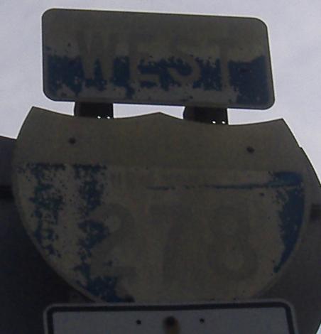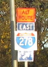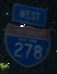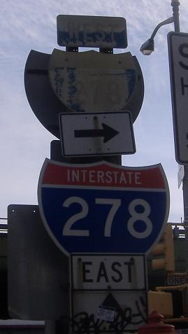 This ancient sign for the onramp to I-278 EB obviously dates from the beginning of the expressway. An I-278 shield never made it onto this sign, and the post holding it up is a design that hasn't been used in at least 50 years. Courtesy Doug Kerr.